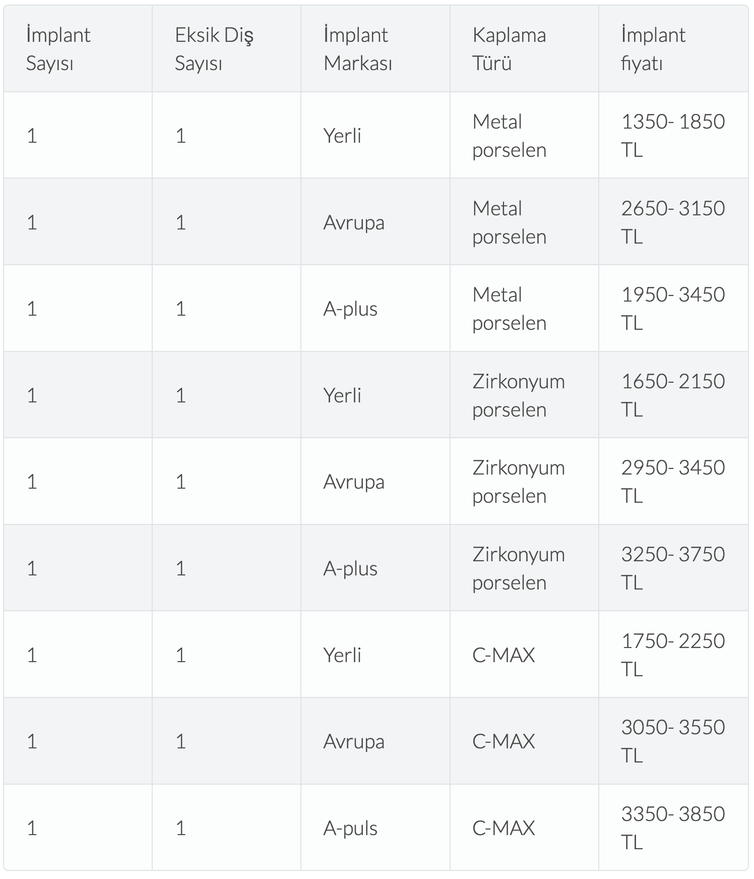 2020 yılı Türk Diş Hekimleri Birliği tarafından belirlenen fiyat, markasına göre bir implant için 2.000 ile 8.000 TL aralığında değişmektedir. Kemik içi implant için fiyat 2.070 ile 2.500 TL aralığındadır. Sert doku grefletme için ise 856 TL’dir. Bu fiyatlar tek çene veya çift çeneye göre fiyat azalabilir veya artabilir.