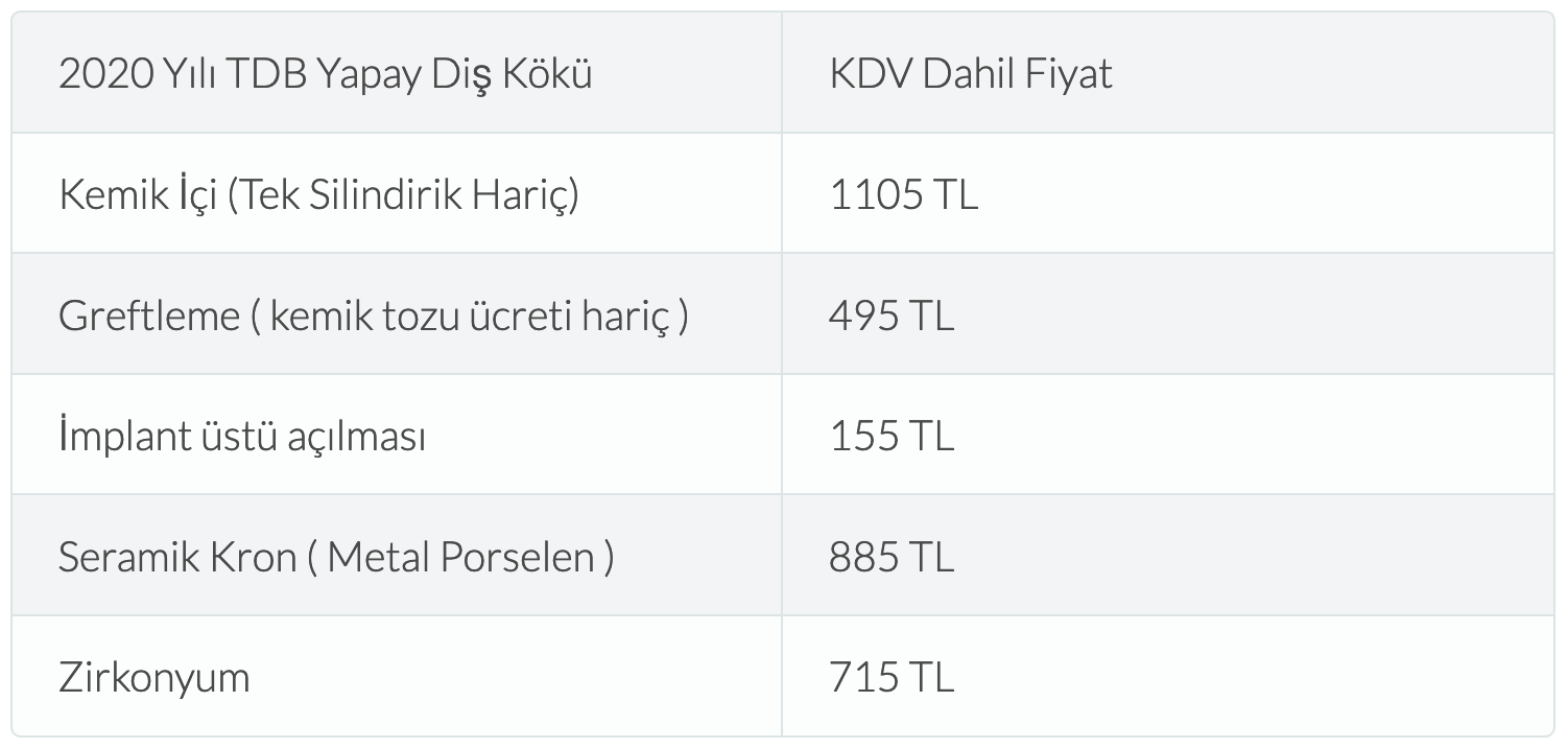 2020 implant fiyatları için Türkiye Diş Hekimleri Odasının belirlediği tarifeye göre, bir kemik içi uygulama bedeli (vidalı diş bedeli hariç) KDV dahil fiyat 1380 TL olarak belirlenmiştir.